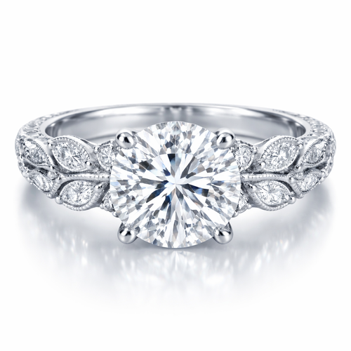 Elegant platinum engagement ring with 3 lab grown best quality diamonds and leaves around the ring.