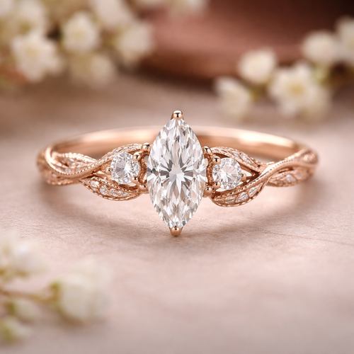 Marquise with a thin twist leaf vineshaped three stone engagement ring