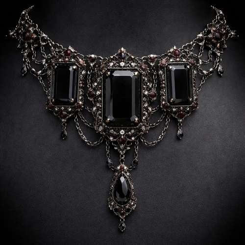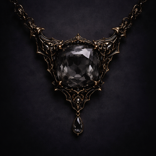A necklace with a dark rich grey pillow shaped diamond, though dark and gothic, a miminilistic touch of mysterious touch...