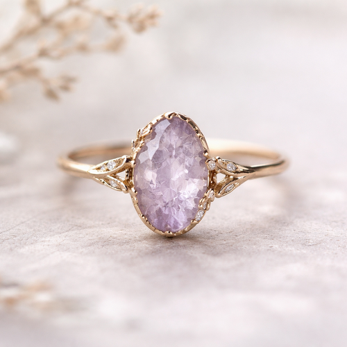 A beautiful light vintage coloured ring with a raw light vintage purple gem, skinny oval shaped and a hint of a miminili...