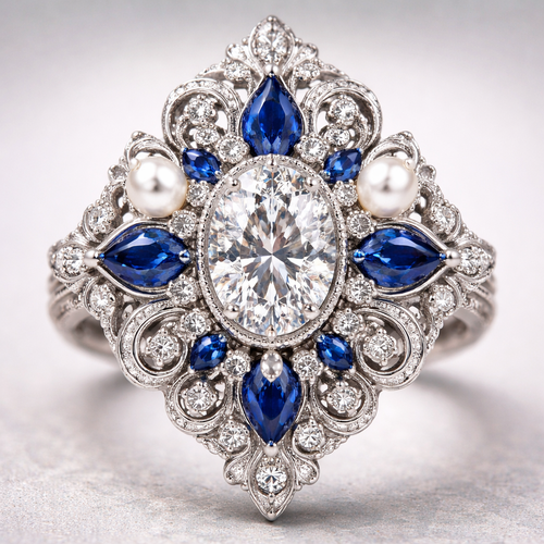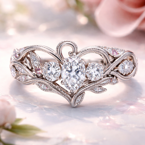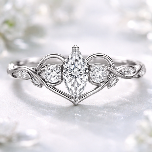 Marquise with a thin twist leaf vine heart design three stone engagement ring