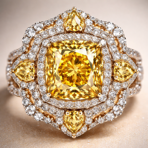 A ring with a rich deep baby yellow pillow shaped gem with tons of diamonds surrounding it and other small baby yellow g...