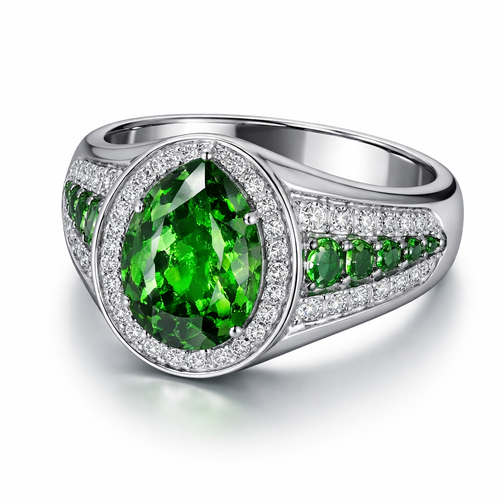 Have a pear shaped vivid green tourmaline of 2.5 carats. Style a pinky ring with the green stone at the center and in th...