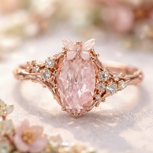 A soft vintage coloured diamond ring with a raw light baby pink gem shaped as a very skinny oval with a tiny butterfly c...