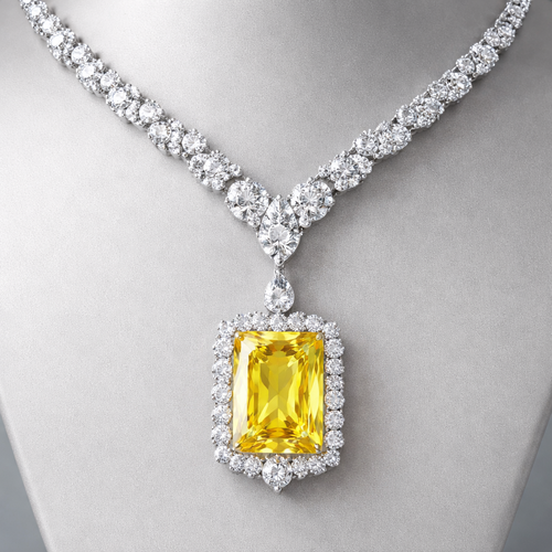 A beautiful diamond necklace with a rectangular baby yellow gem