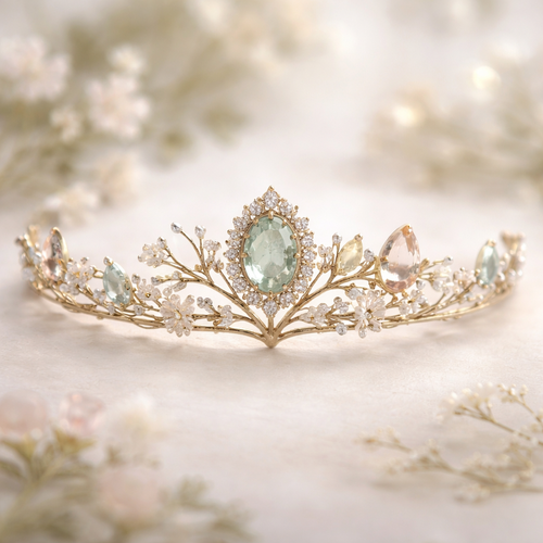 A beautiful crown with a light baby purple amethyst gem with light gold architecture and tiny diamonds