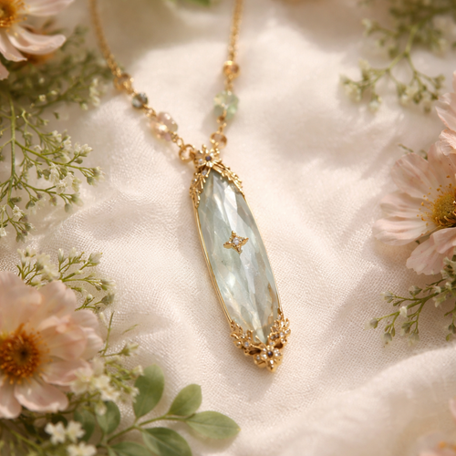A beautiful soft coloured necklace with a skinny rectangular vintage green gem with a tiny tint of pink in it