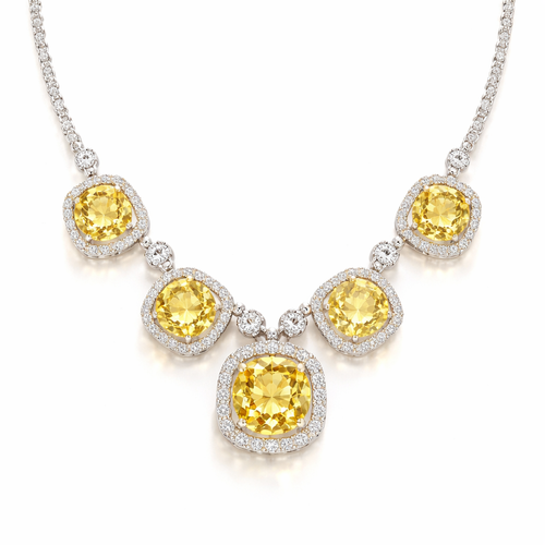 A necklace with bright rich baby yellow gems and diamonds surrounding them with a hint if miminilistic style