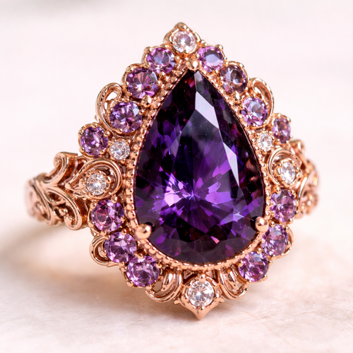 A ring with a teardrop shaped dark purple gem with lots of shines on it. Lots of smaller purple gems surround it with ro...
