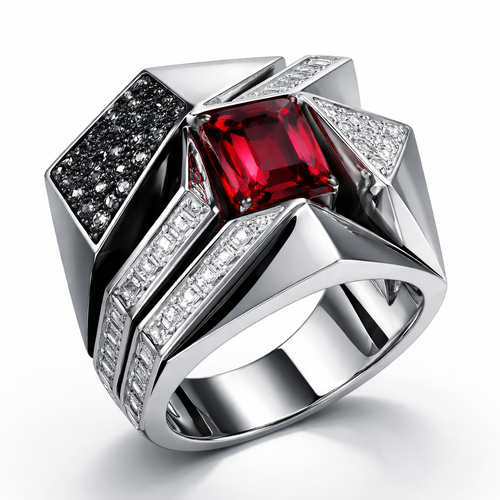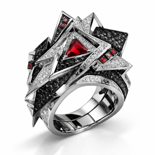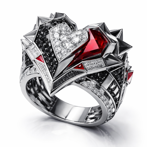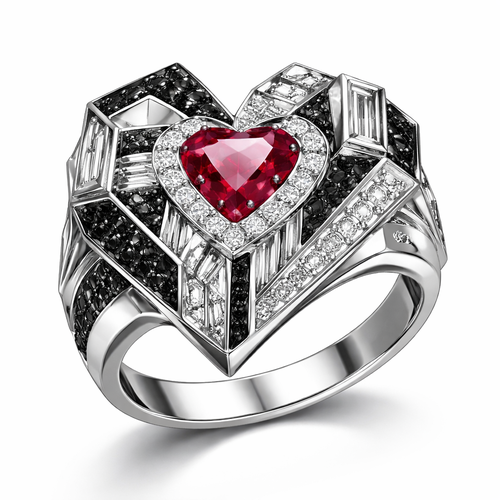 Modern Geometric ring of heart of architecture shape and edges of bold style with white and black and ruby diamond o...