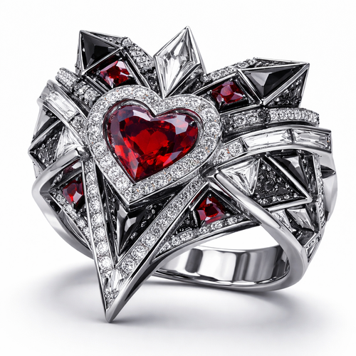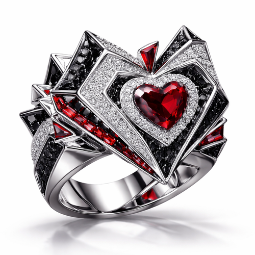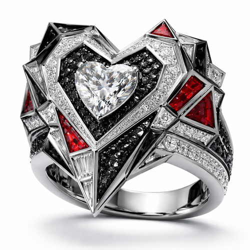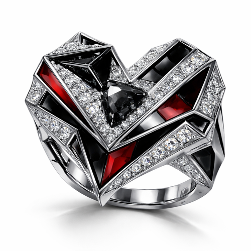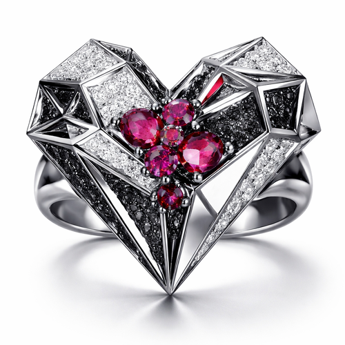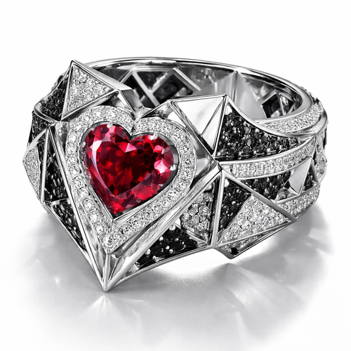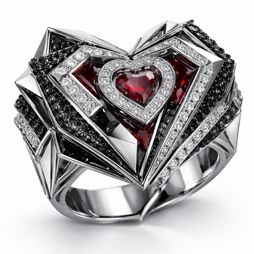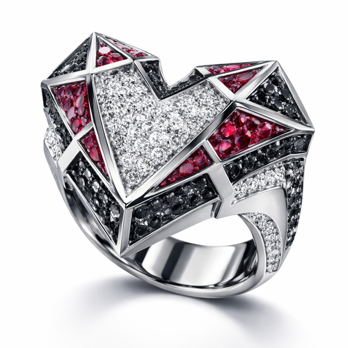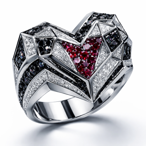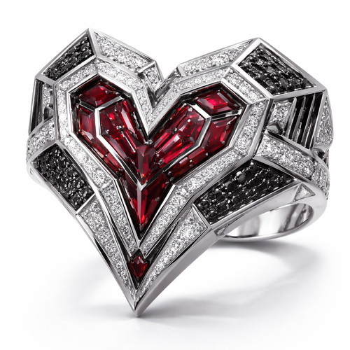 Modern Geometric ring of heart of architecture shape and edges of bold style with white and black diamond and ruby of ...