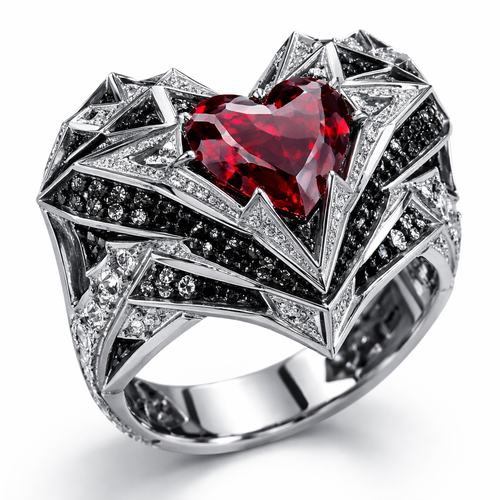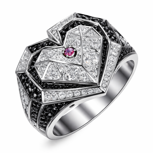 Modern Geometric ring of heart of around shape and edges of bold style with white and black diamond and small ruby of ...