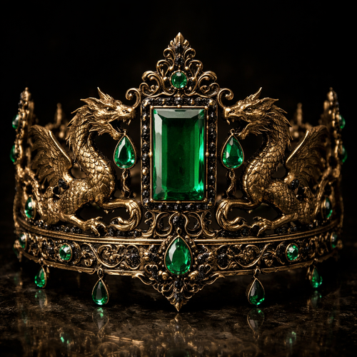 A crown with a dark rich baby green rectangular shaped gem with dark rich golden carved dragons with their mouths open a...