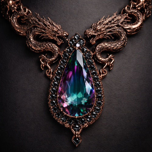 A necklace with a giant teardrop shaped dark alexandrite with dark rose gold carvings of lions fighting over who should ...