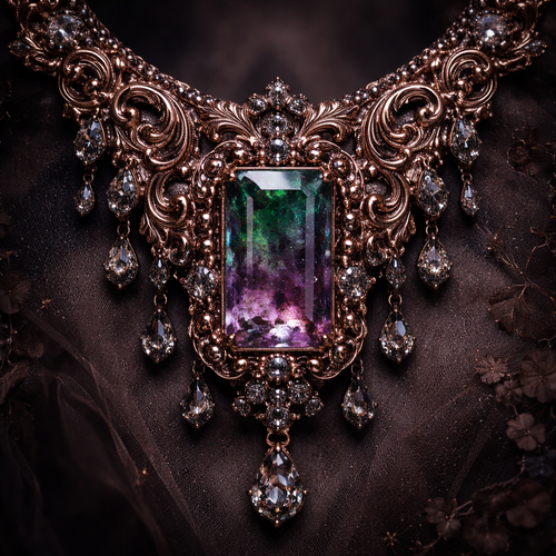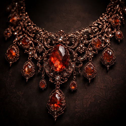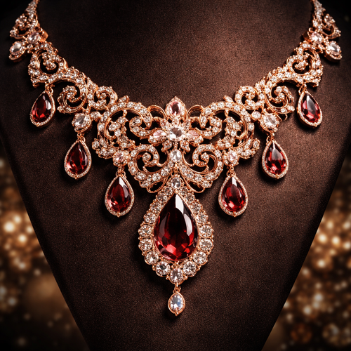 A beautiful necklace with lots of dark rose gold and gems