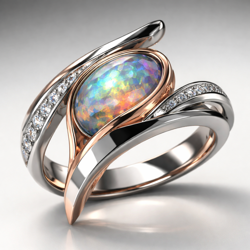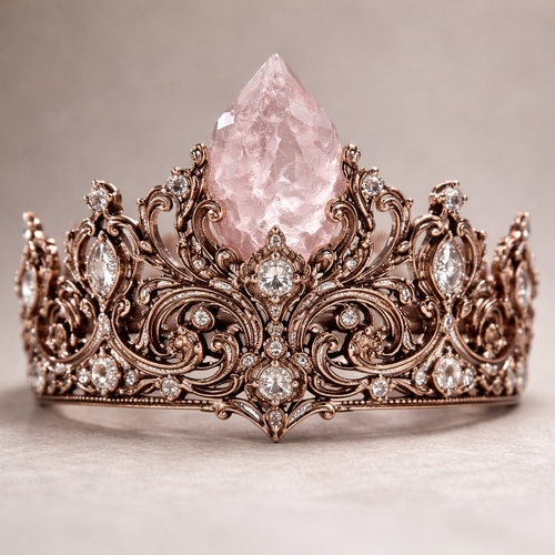 A crown with a raw light baby pink gem with dark rich rose gold carvings and diamonds