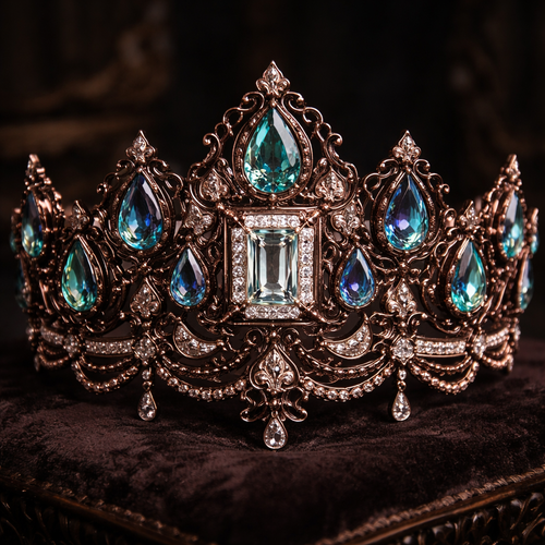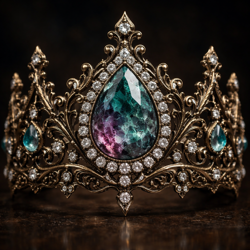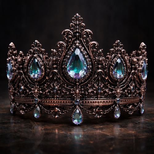A dark rose gold crown with lots of Alexanderite gems and black diamonds surrounding them