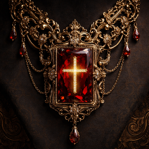 A necklace extreme dark rich gold architecture and a rectangular shaped painite gem with a cross in the middle of it