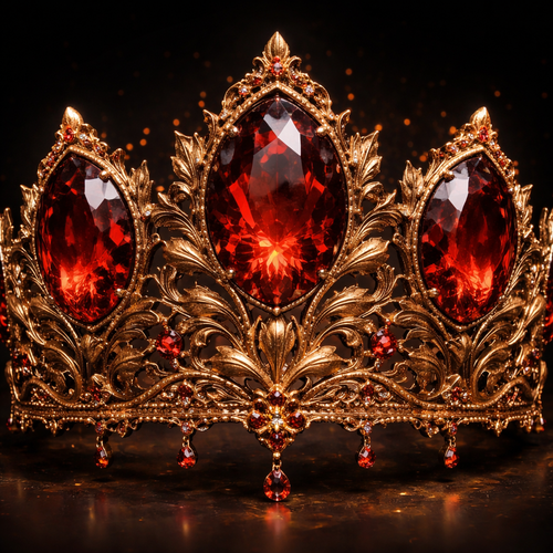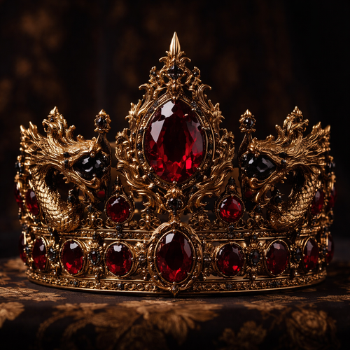A dark rich gold crown with lots of dark royal red diamonds with dragon carved gold with black diamonds in their mouths