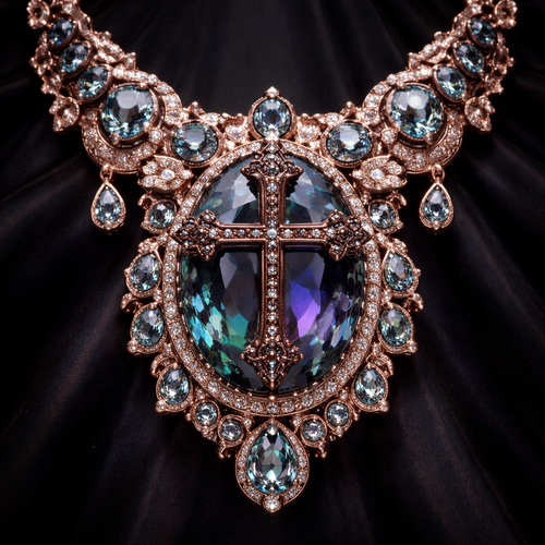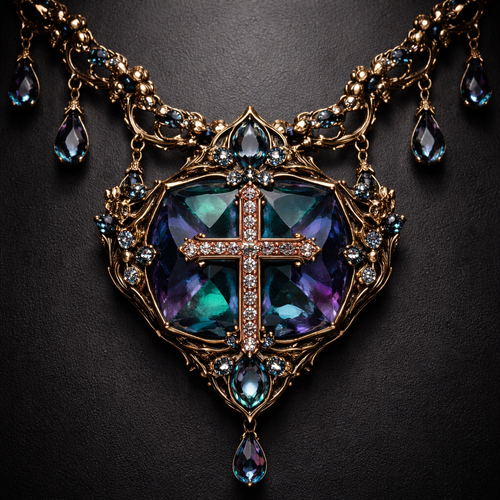 A luxurious dark rose gold necklace with an Alexanderite gem with a dark gold cross on top of it with smaller alexanderi...