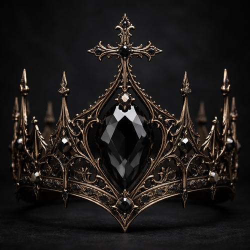 A crown with a black diamond and dark gold architecture with a cross in between the gem