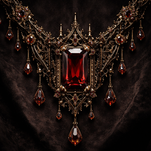 A necklace with a rectangular blood red diamond with painite gems surrounding it and gothic dark gold architecture