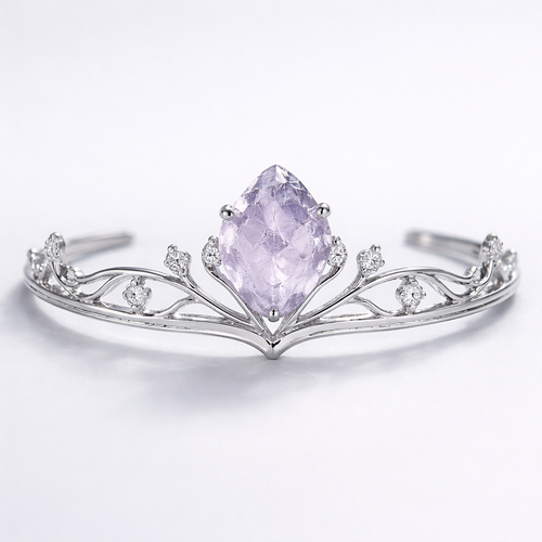 A crown with a raw shaped light baby purple gem and platinum carvings with smaller white diamonds