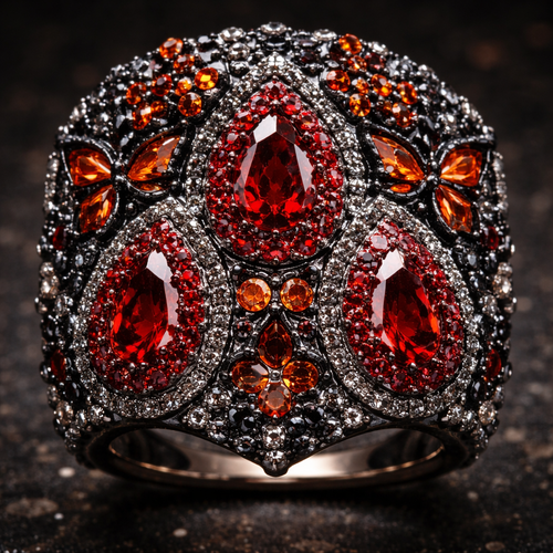 A ring with 3 teardrop shaped red diamonds and thousands of red gems surrounding with hundreds of butterfly shaped dark ...