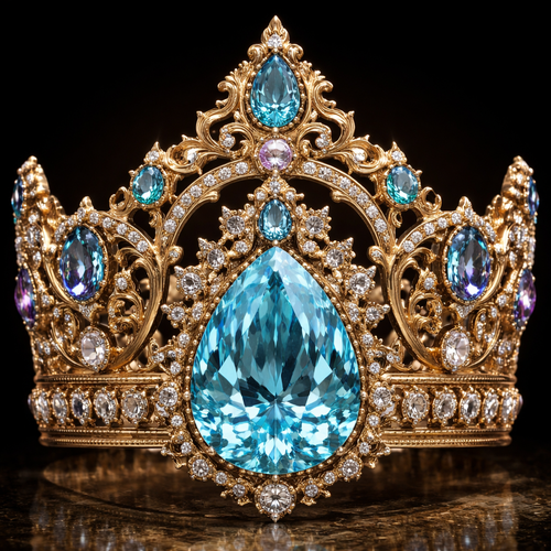 A crown with a giant baby blue diamond at the bottom with golden details and small alexandrite gems to add extra detail
