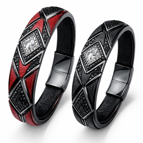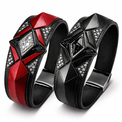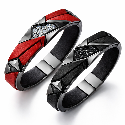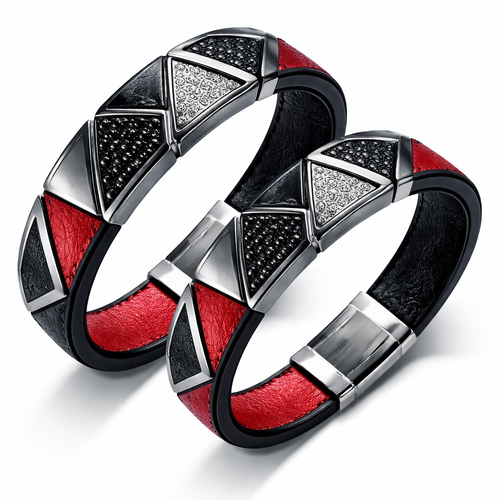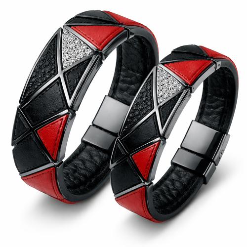 Geomatric leather bangel red and black of geomatric shape and bold style and edgey for matching couples of white backgro...