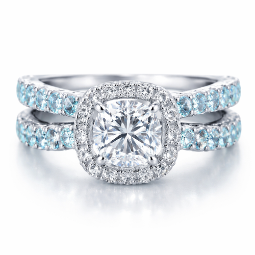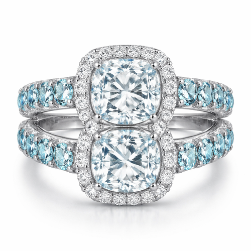 Combine 2 rings that are both a cushion cut diamond with halo and both have an aquamarine band, connect them with one on...