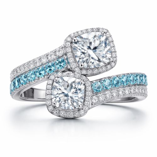 Ring with 2 cushion cut diamonds, on a little smaller than the other, add 2 aquamarine bands