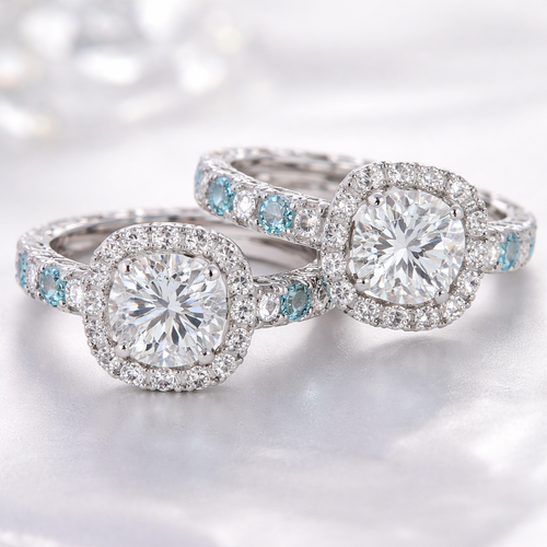 2 rings that are both a cushion cut diamond with halo and both have an aquamarine band, connect them