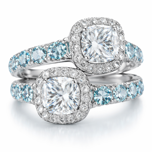 Combine 2 rings that are both a cushion cut diamond with halo and both have an aquamarine band