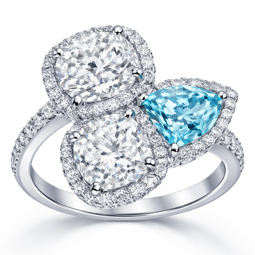 Ring with 2 cushion cut diamonds, on a little smaller than the other, add aquamarine