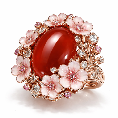 Earrings gold with emerald leaves climbing on the side and ruby flowers