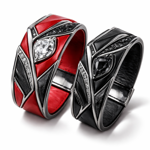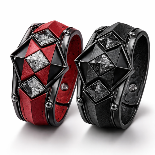 Geomatiric leather bangel red and black of geomatric shape and bold style and edgey and sharp for matching couples of wh...