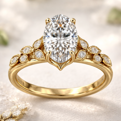 Ring with curved band with flowers pattern on it with small diamonds on it and a big marquis diamond 3 carat horizontall...