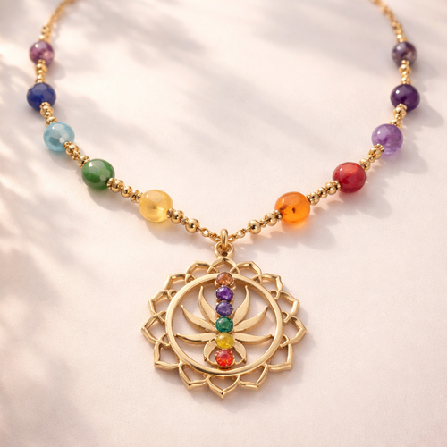 necklace with a gold chakra pendant, several natural stones separated by a gold chain