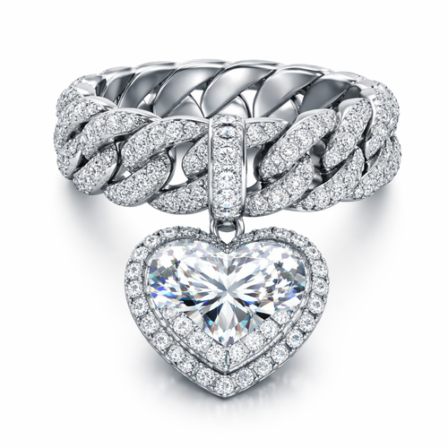 A modern women's ring made of silver with diamond stones. H.L.E for the pendant unique design with a Cuban link