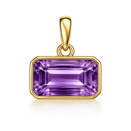 A pendant charm with a 3 carat emerald cut amethyst in a bezel setting set east west with plain gold bale on top in yell...