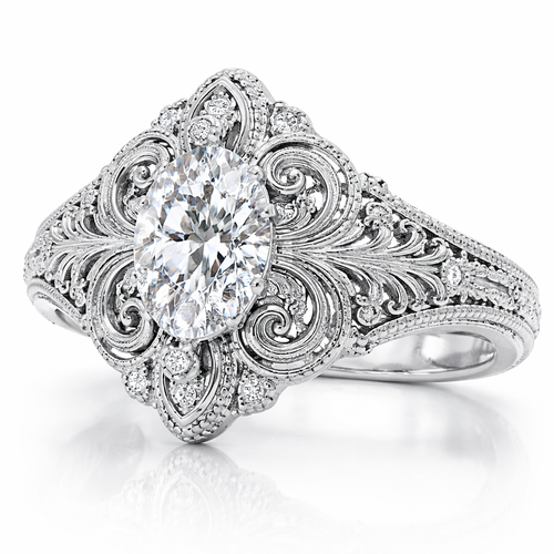 create a 2.5ct moval engagement ring where there are claw prongs on the north south east and west sides of the center mo...