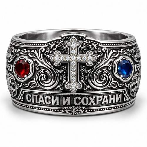 Wide silver ring in traditional Russian Orthodox style, oxidized silver with blackened engravings. In the center a raise...