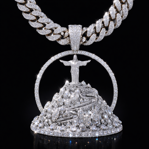 A nature men's necklace made of white gold with diamond stones. I want a diamond pendant 3D of Mt cristo rey with a diam...