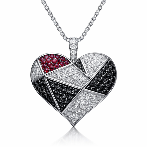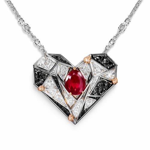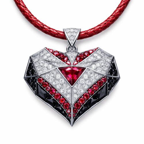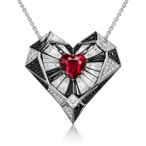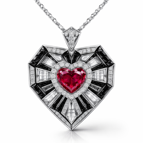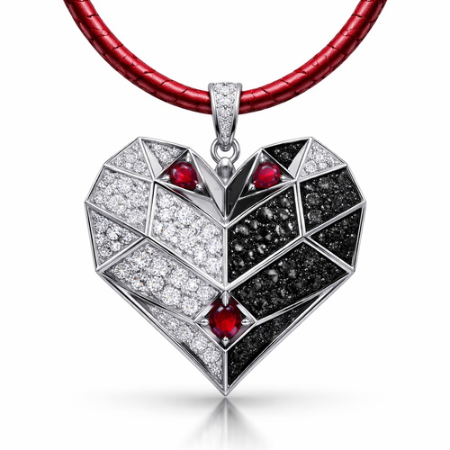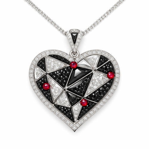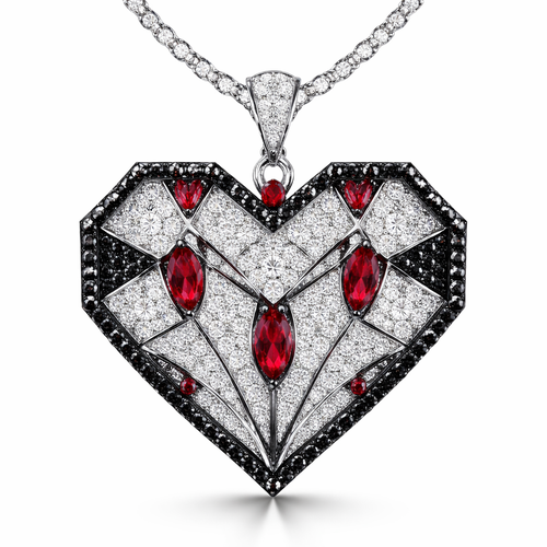 Geomatric pendant of heart of ede style and shape white black diamonds of love shape of little bit atones of ruby of whi...