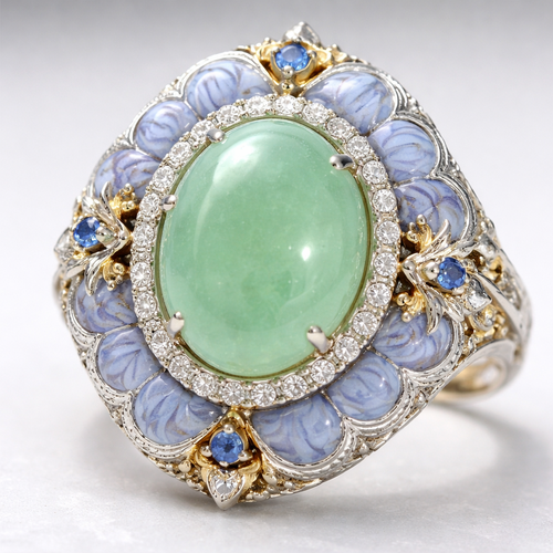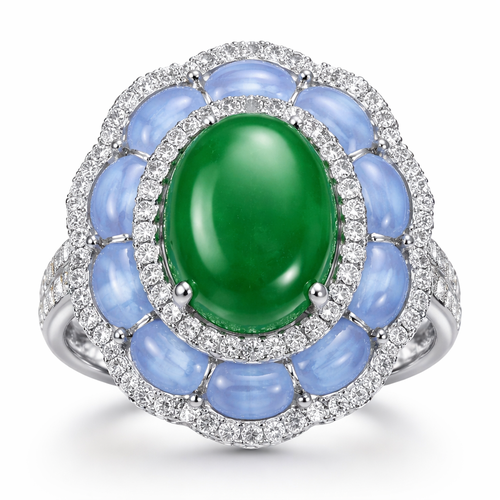 Make a ring with a green jade stone in the middle with blue lace agate around it and circled with diamonds.