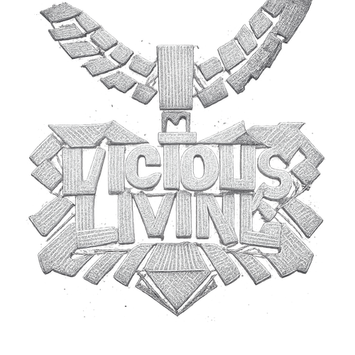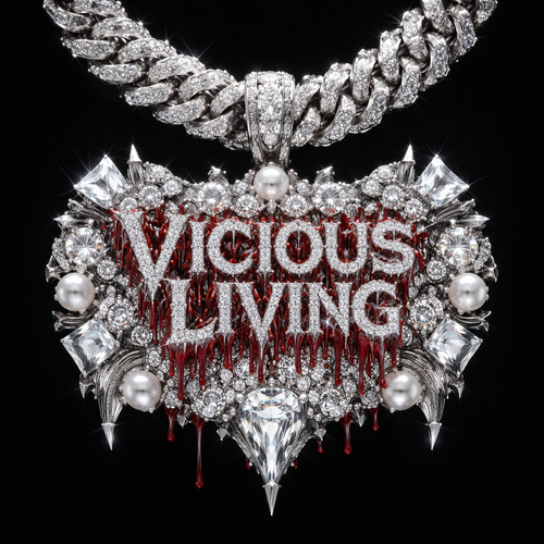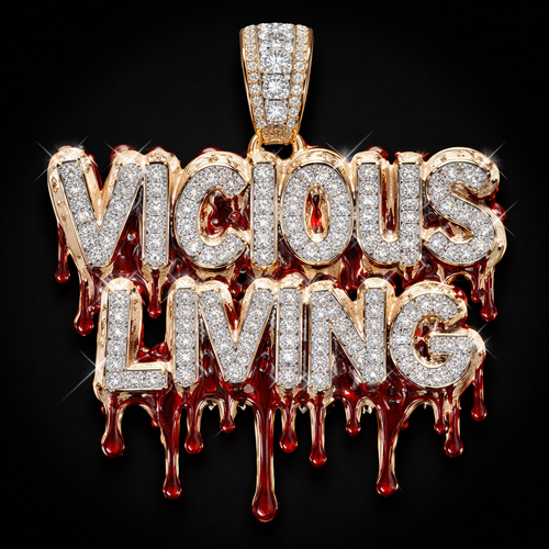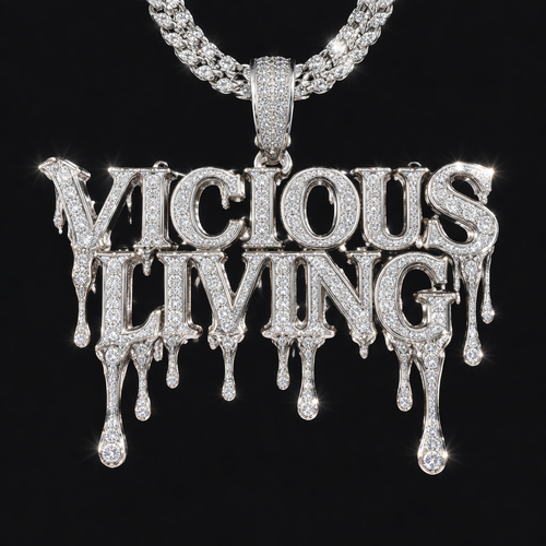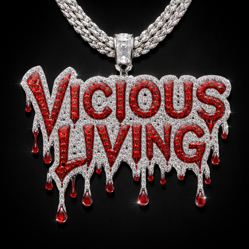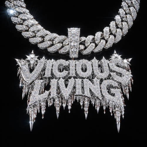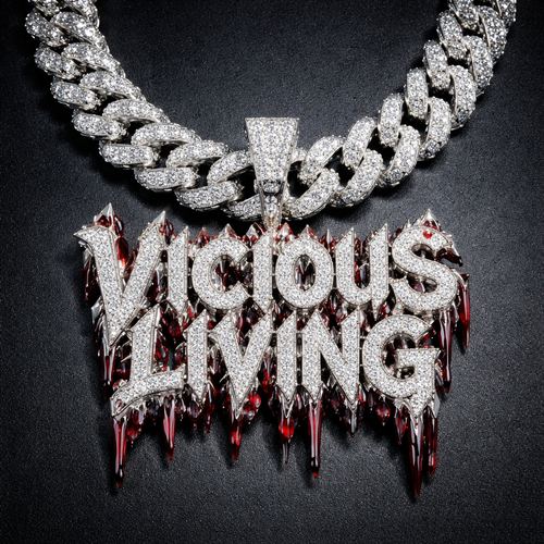 Blood Font written VICIOUS LIVING The Chain (Cuban Link): It is a custom, heavy-duty Cuban link chain made of white gold...