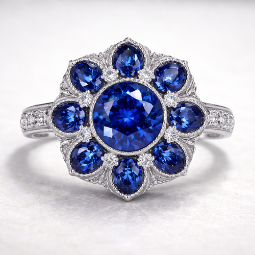 ring features a large round blue sapphire set at the center, elevated slightly above the rest of the stones. Surrounding...