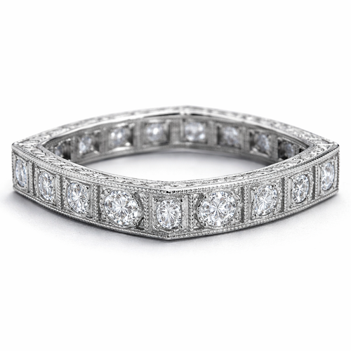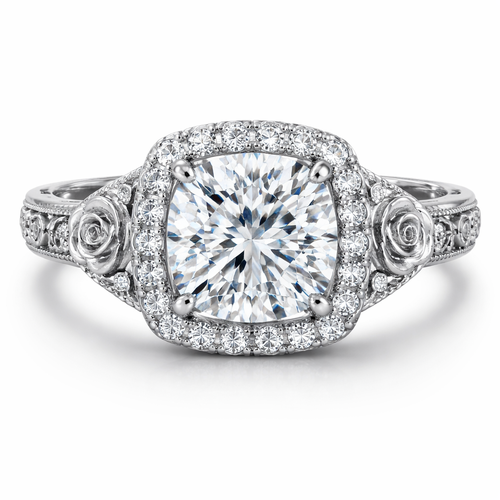 Cushion cut wedding ring with halo and rose engraving on the shoulders