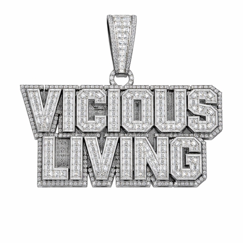 Font written VICIOUS LIVING It is a custom, heavy-duty Cuban link chain made of white gold. The links are exceptionally ...